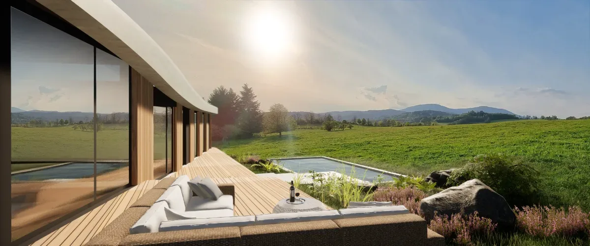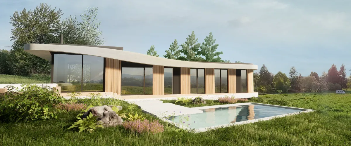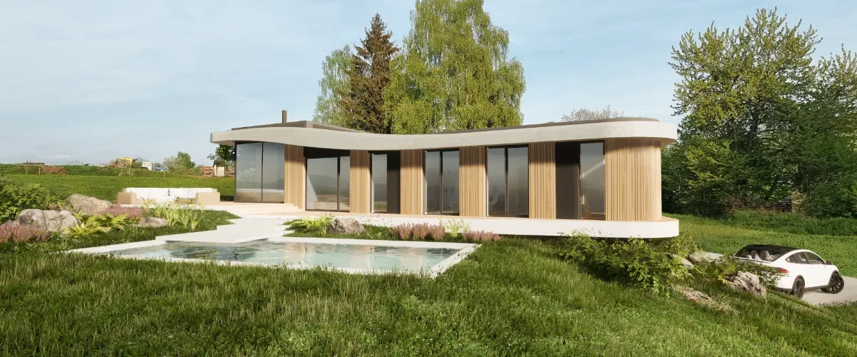 Novostavba objektu je řešena s maximálním ohledem na požadovanou obytnou funkci a provoz rodiny investora, který bude objekt využívat pro vlastní rodinné bydlení. Obytná část kosodélníkového půdorysného tvaru o rozměru 23,00m x 9,60 m se dvěma zaoblenými rohy je výškově členěna na 2 asymetrické části. K této hlavní hmotě objektu je z jižní strany připojena garáž s technickým zázemím obdélníkového půdorysného tvaru o rozměrech 7,70m x 7,05m. Střecha objektu je navržena jako plochá nepochozí. Objekt rodinného domu a navazující garáže s technickým zázemím je navržen jako monolitický s železobetonovými stěnami v kombinaci s ocelovými sloupky, které jsou vyplněny betonovou směsí. Strop nad přízemím je tvořen ŽB deskou tl. 200 mm a je výškově odskočen tak, aby v hlavní pobytové místnosti č. 109 bylo docíleno zvýšené světlé výšky 3,860m, ve zbývajících pobytových místnostech je světlá výška 2,700m, v komunikačních prostorech a koupelně je s ohledem na trasování instalací VZT pod stropem navržen sádrokartonový podhled a světlá výška tak odpovídá 2,400m. V prostoru garáže a tech.zázemí je světlá výška díky nižší úrovni založení podlahové desky 3,400m.